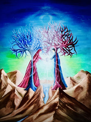Dieses Bild habe ich vor Jahren gemalt aus dem tiefen Spüren einer geheilten, reifen Beziehung zwischen Mann und Frau.